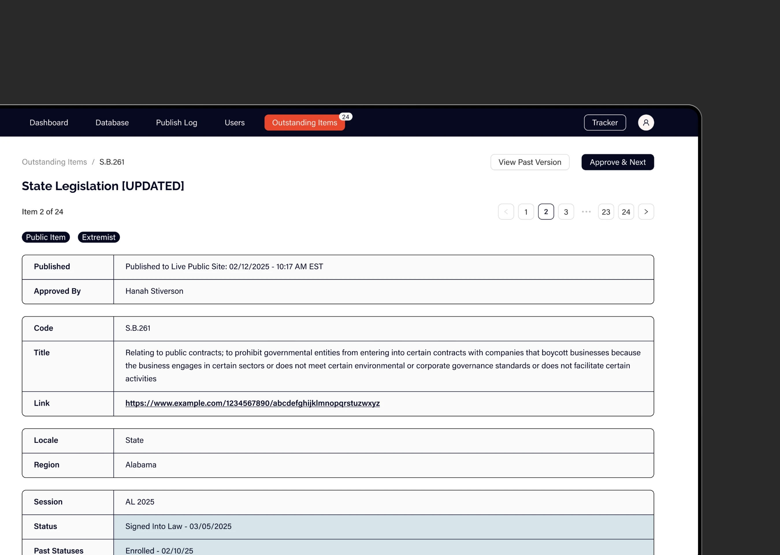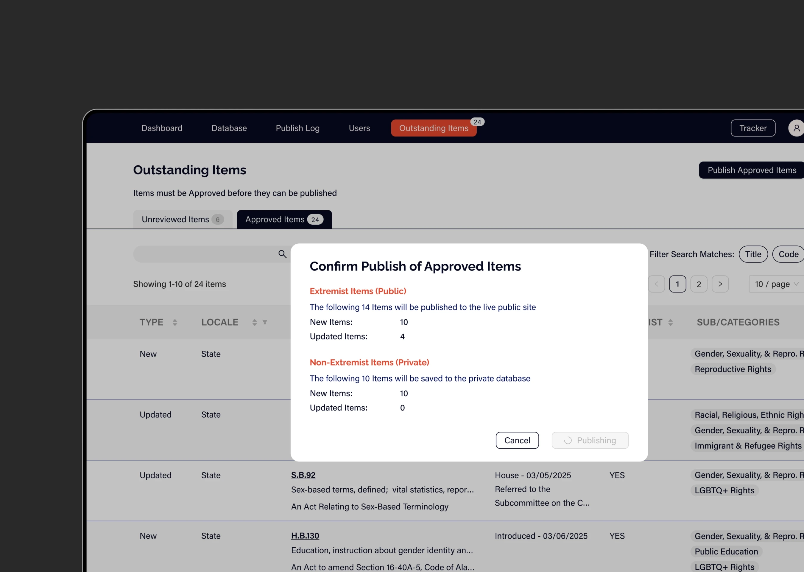 This component of Democracy Watch is internal-facing and essential to the platform’s functionality. It enables the DPP team to review and manage legislation processed by the AI, verify its categorization, and ensure accuracy. The team can publish new bills to the public site, as well as update or remove existing ones as needed.