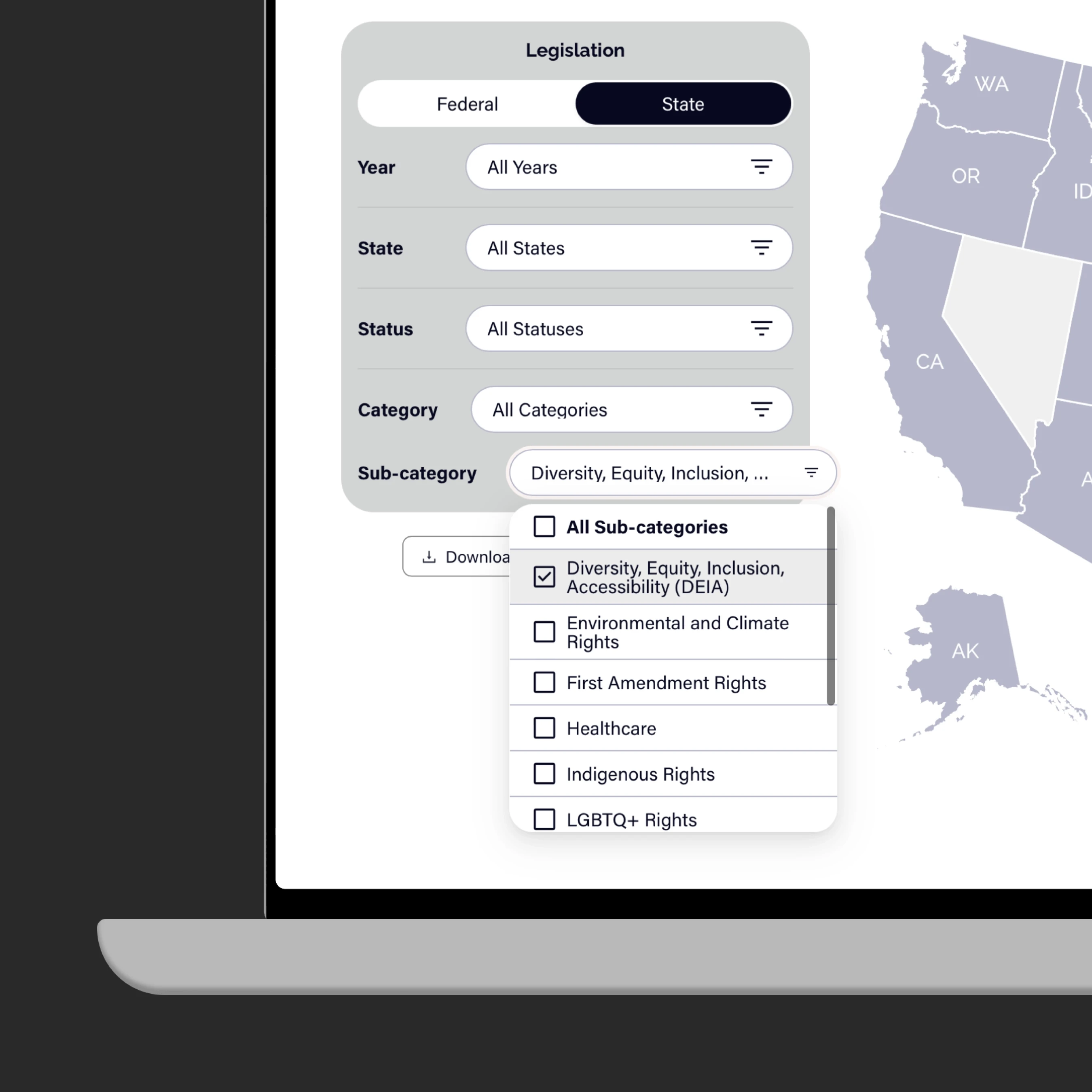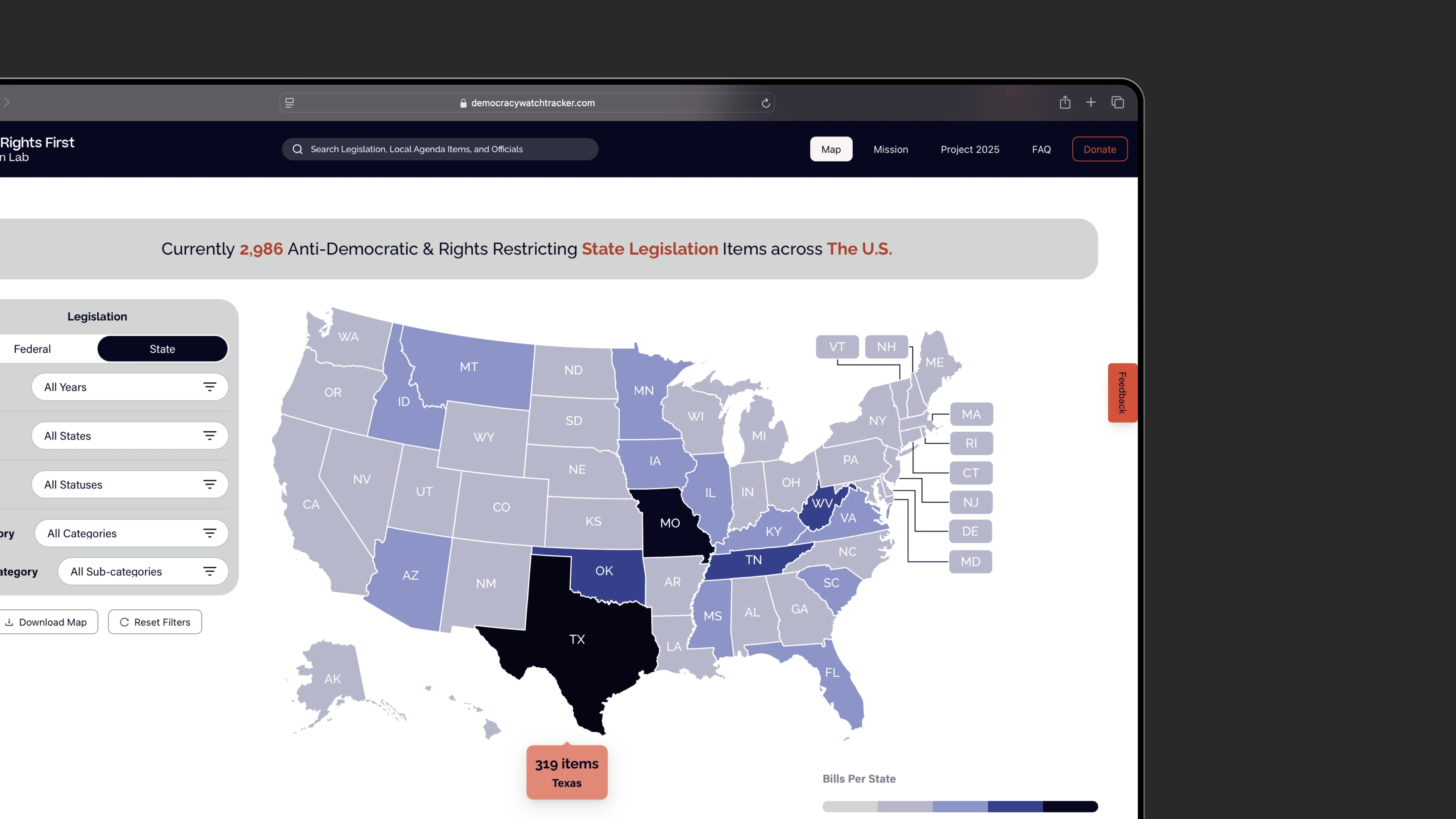 Track threats to democracy by filtering and visualizing legislation by state, category, year, and status.