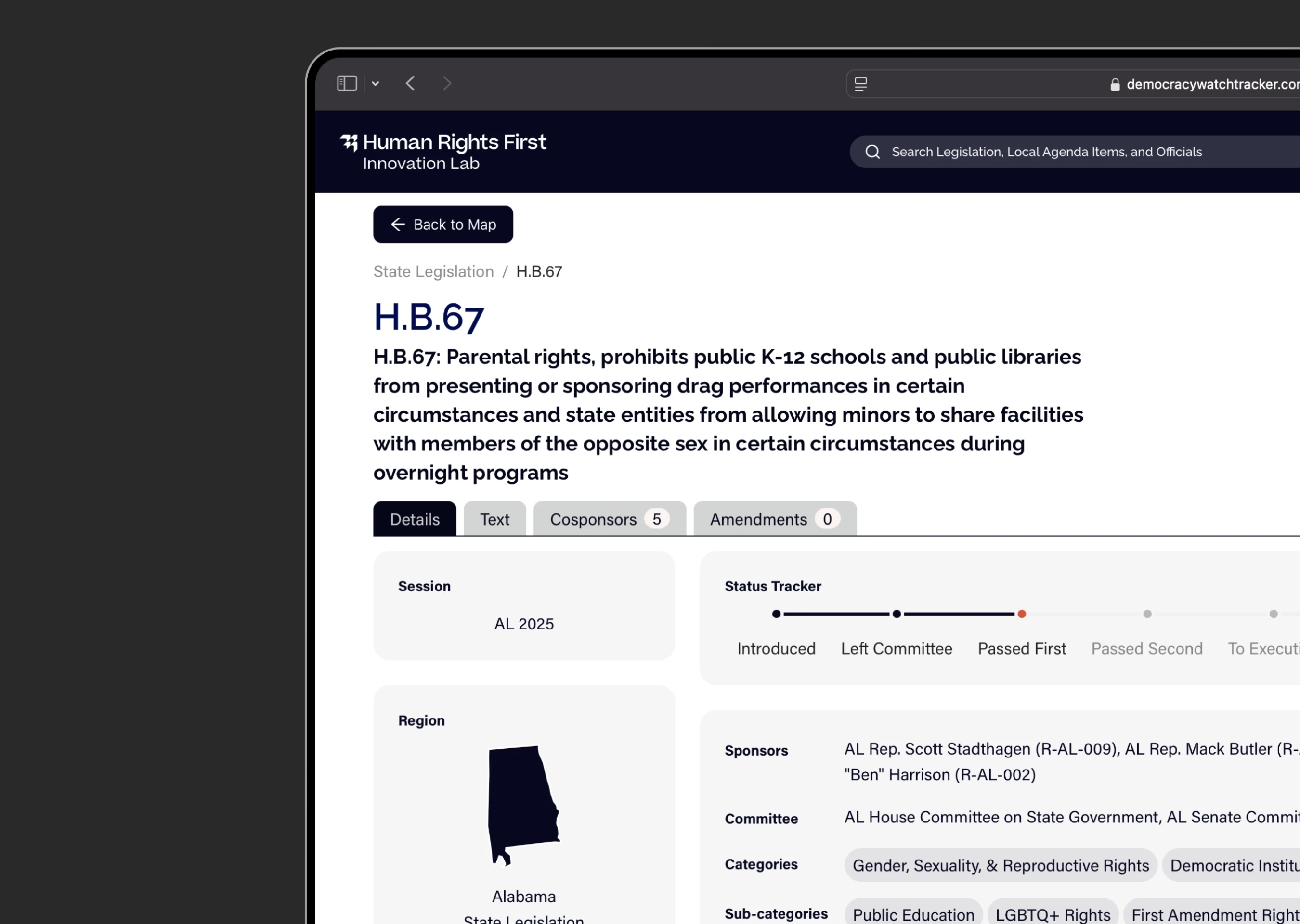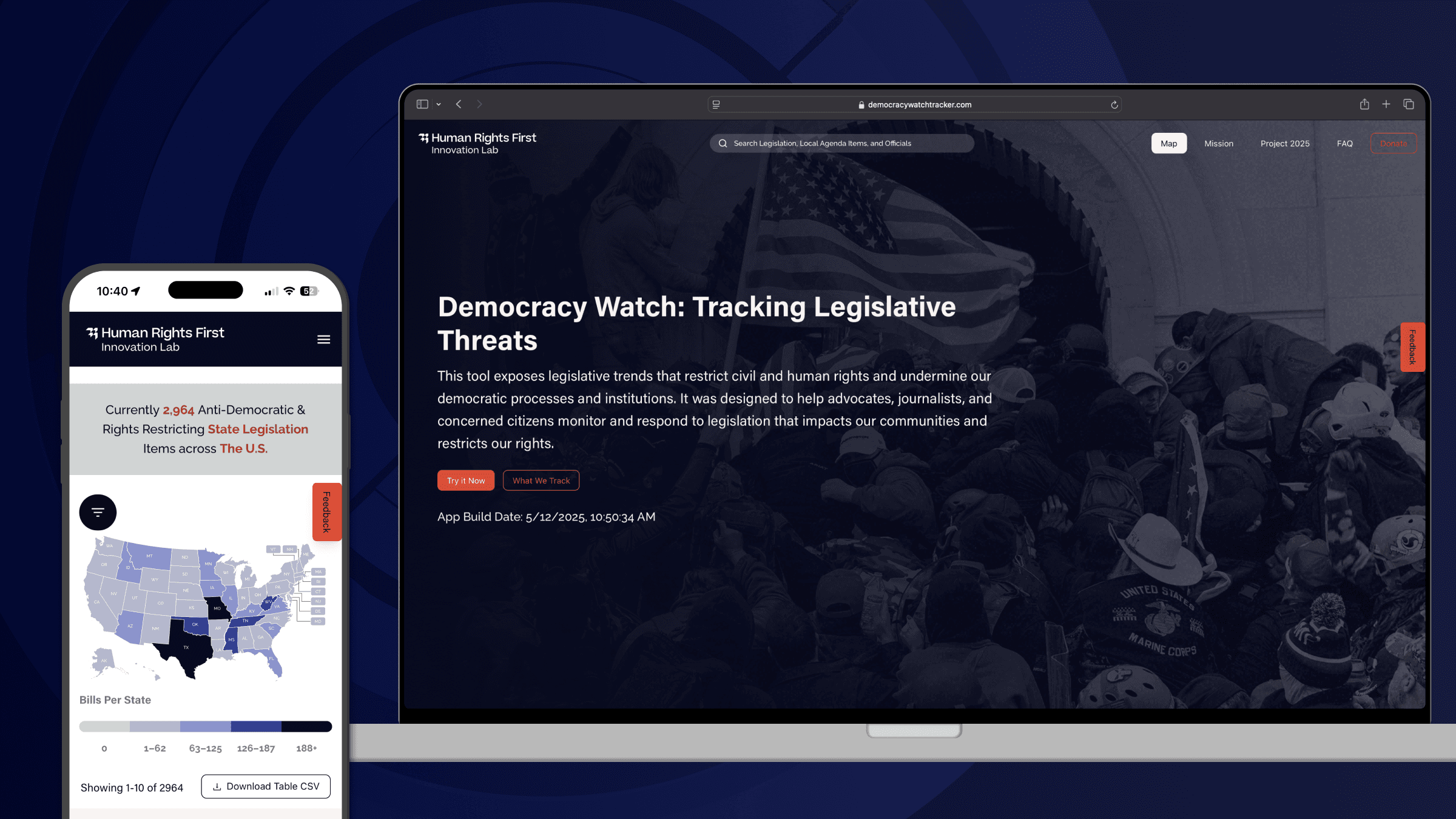 In 2025, Human Rights First launched Democracy Watch, a tool that tracks and maps legislation and executive orders that threaten marginalized communities and democratic institutions.